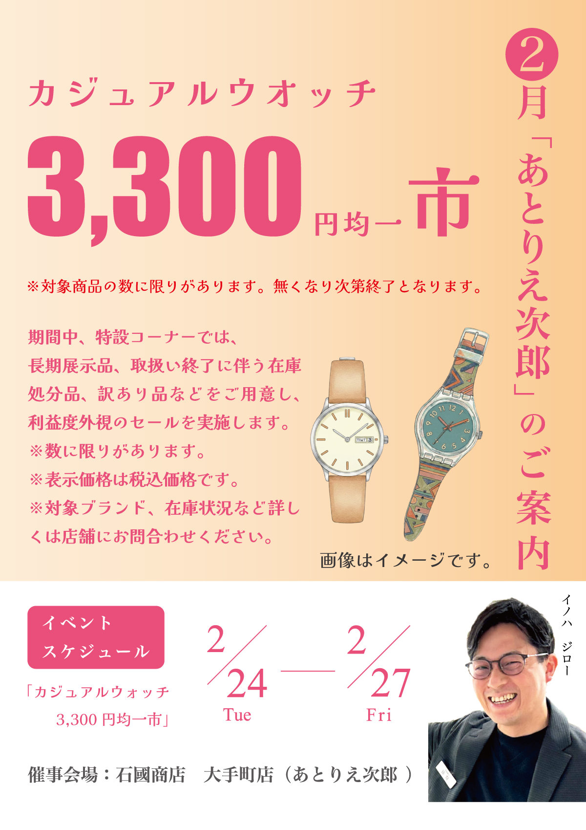 あとりえ次郎(石國商店 大手町店)より「カジュアルウォッチ3,300円均一市」のお知らせ